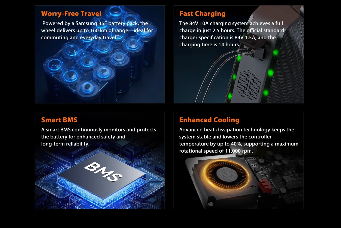 One standout feature of the King Song 16X Pro is its massive 1554Wh battery, which offers a real-world range of approximately 145–160 km. This is significantly more than what you'll find on other unicycles in its class, making it an excellent choice for long-distance riding. Whether you're commuting to work or exploring the city, the 16X Pro has you covered with its extra-wide 3-inch tire for maximum stability.